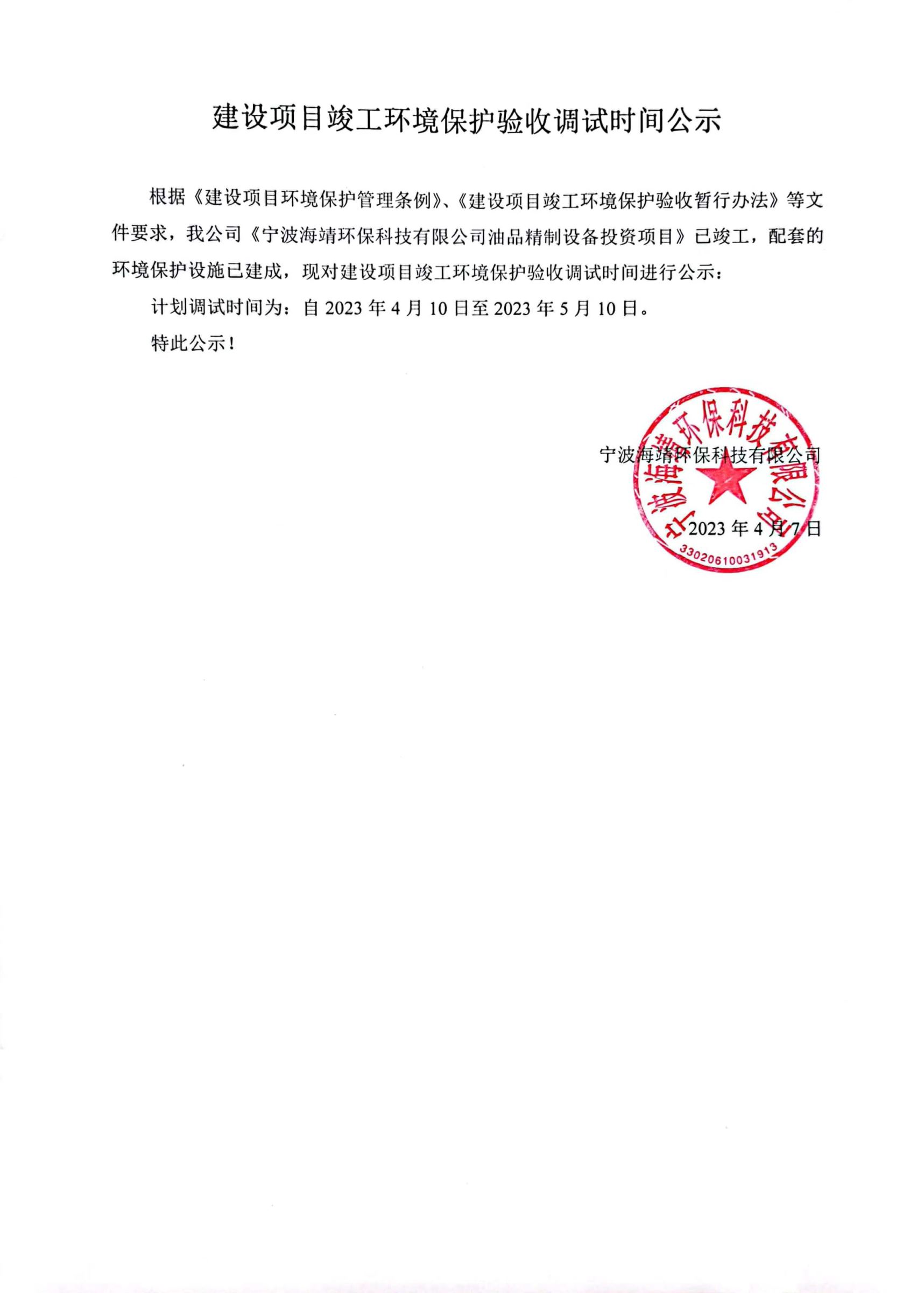 建设项目竣工环境保护验收调试时间公示