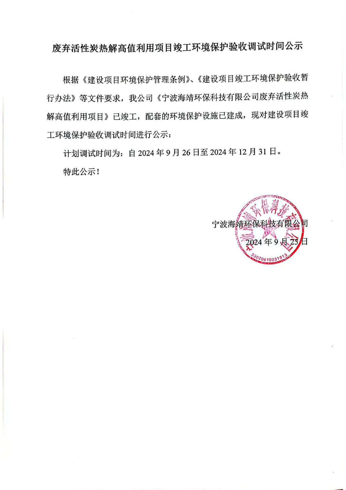 废弃活性炭热解高值利用项目竣工环境保护验收调试时间公示