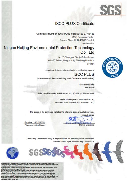 近日,宁波海靖环保科技有限公司凭借在油污水资源化利用领域的突出优势,正式通过国际权威机构的严苛审核,成功斩获ISCC(可持续发展与碳认证)国际认证证书。作为油污水及废矿物油资源化利用行业首家获得此项认证的企业,这一成果标志着公司在可持续生产、碳足迹管理领域已达到国际领先水平,为公司向欧盟等国际客户提供含油污水处理服务奠定了关键资质基石。