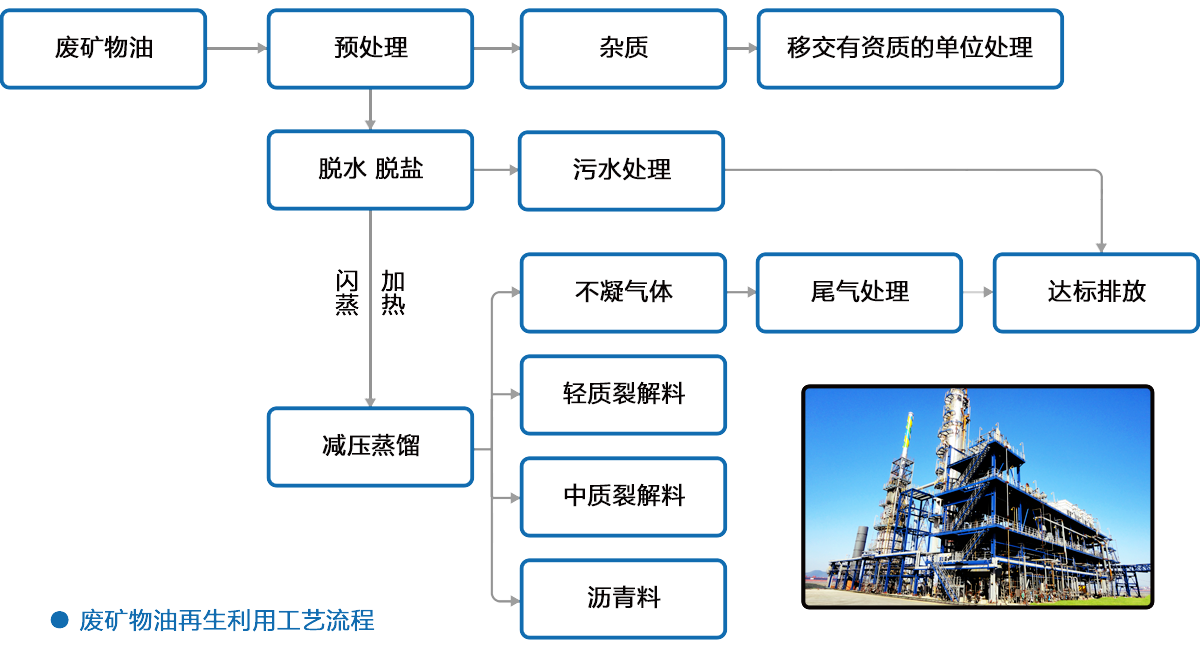 以废矿物油、油污水为原料,经油污水综合利用装置处理后,油品通过蒸馏分离提取中质裂解原料、重质裂解原料、建筑沥青和燃料油等高附加值化石原料。分离出来的废水则通过废水处理场进行综合处理后,达标排放。储存、生产、废水治理所产生的废气全部进行回收集中处理,通过组合式生物除臭设备处理后的废气,可满足最新版国际和国家标准《恶臭污染物排放标准》GB14554-1993。